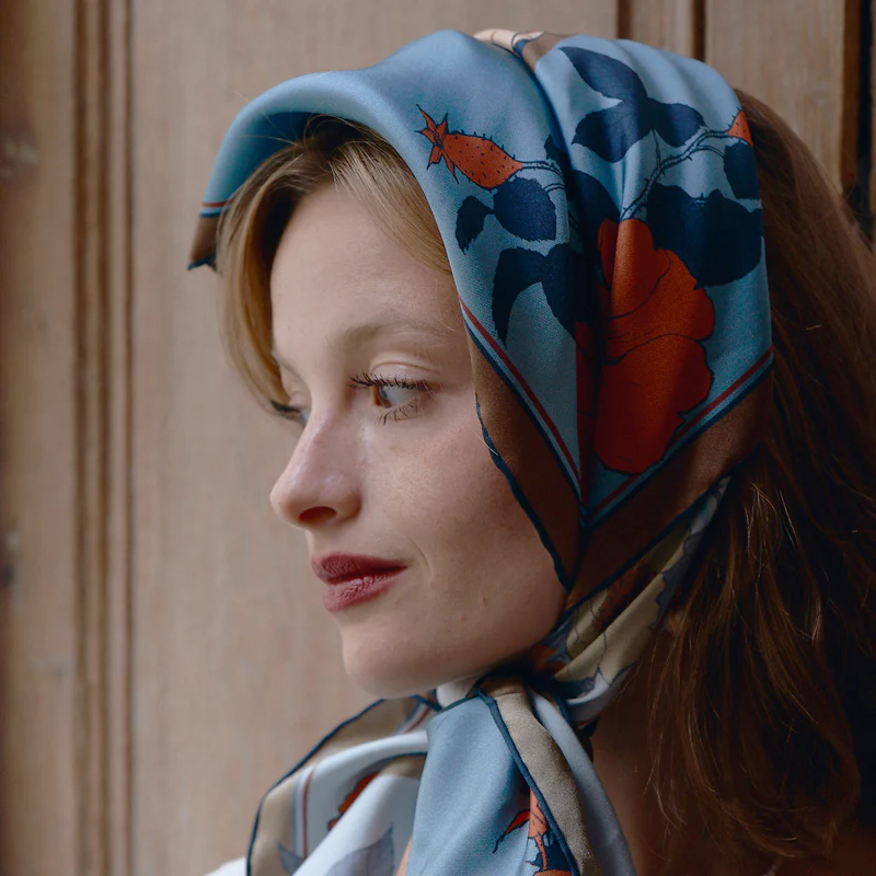 mulberry silk twill, slightly hard touch and feel. The original hand-drawn pattern is presented on the silk scarf. Advanced curling technique. |